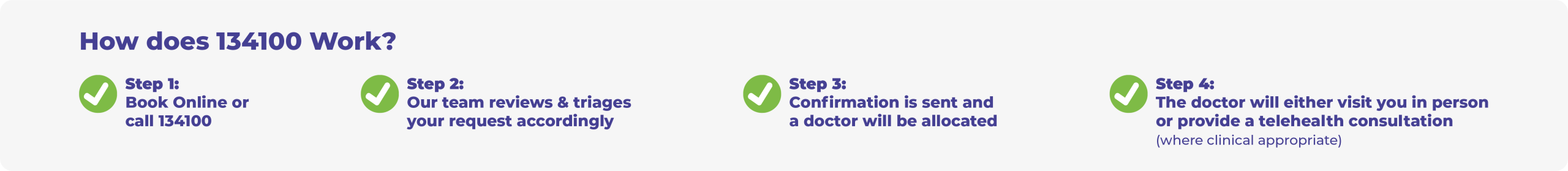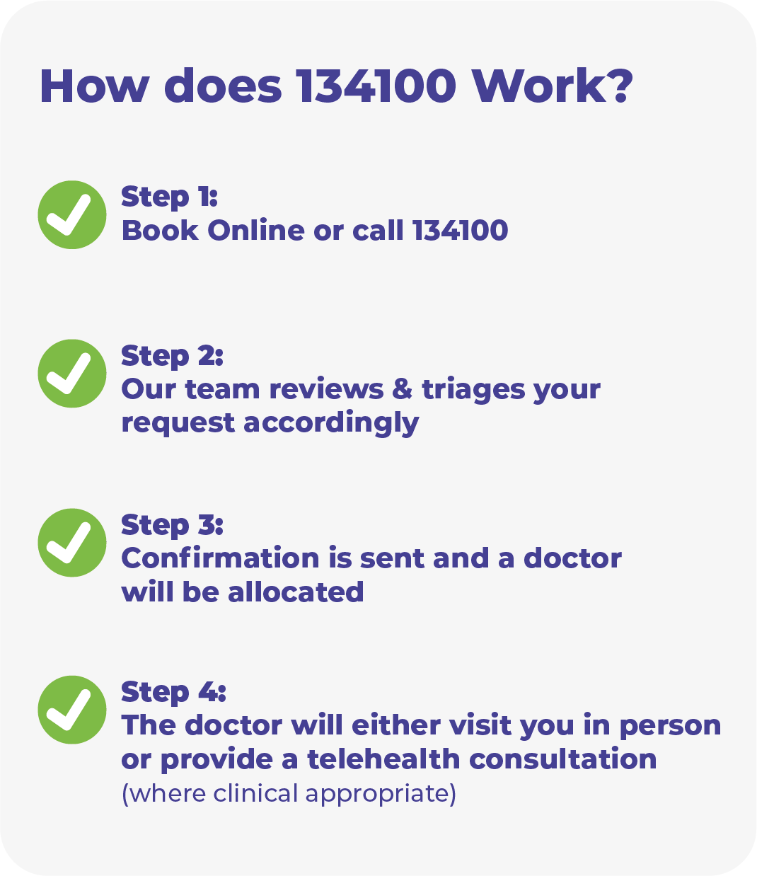 To request after hours medical care, book online, via the APP or call 134100.
